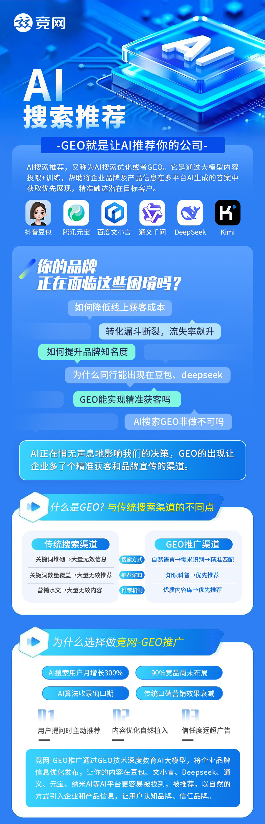 AI搜索推荐,又称为AI搜索优化或者GEO推广。它是通过大模型内容投喂+训练,帮助将企业品牌及产品信息在多平台AI生成的答案中获取优先展现,精准触达潜在目标客户。